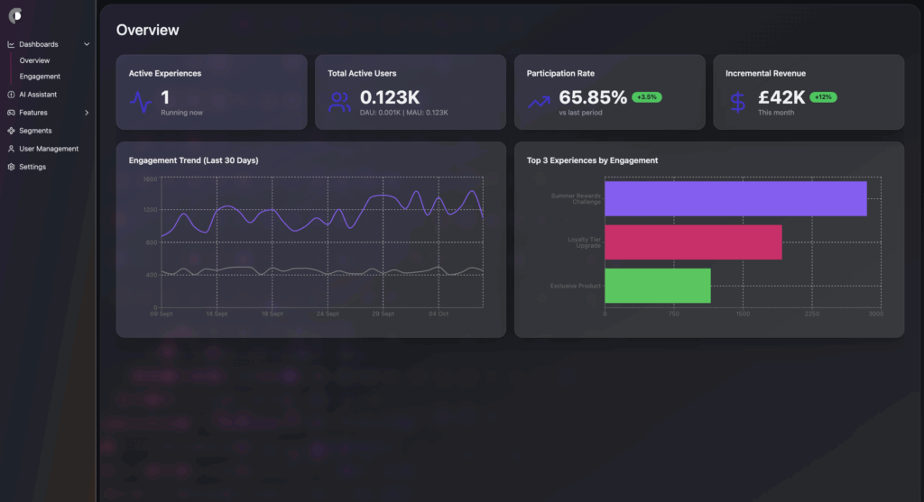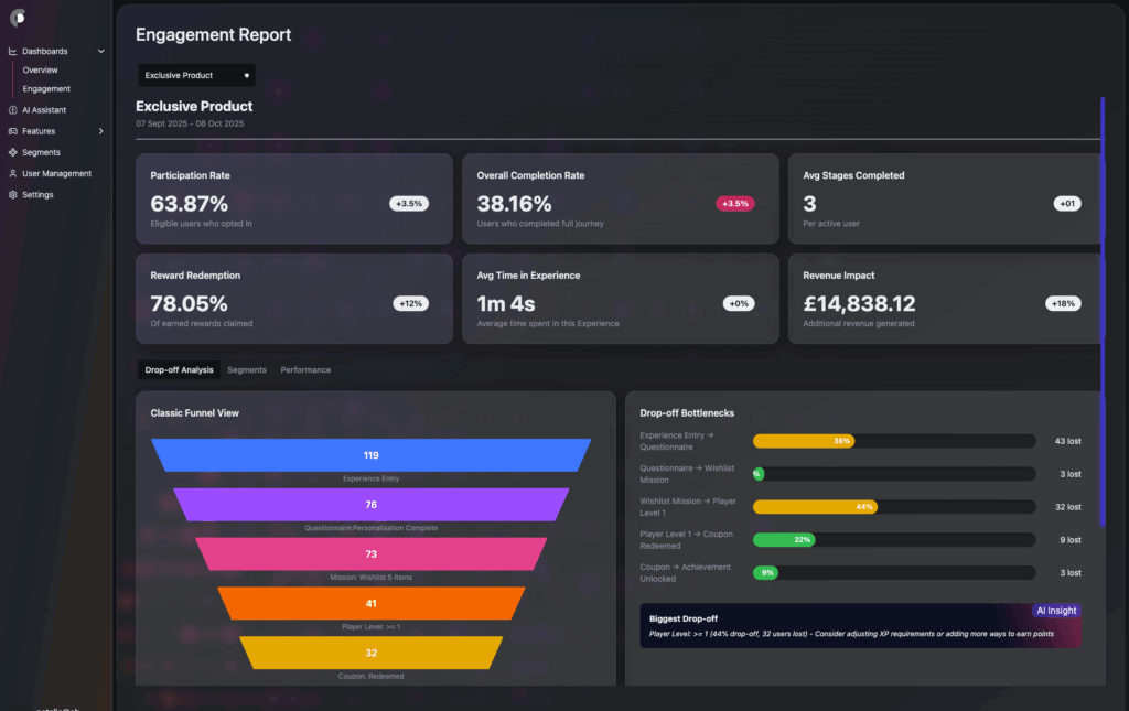 Experience-led dashboards are built for action. They allow marketing and product teams to optimise while a campaign is live. You can compare user cohorts, test variations of missions or streaks and see the direct impact of adjustments on engagement levels.